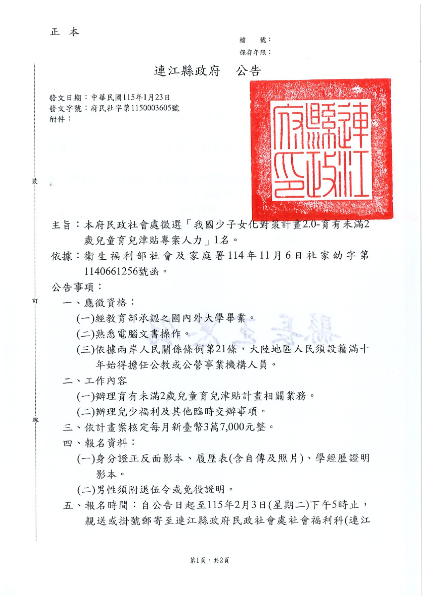 本府民政社會處徵選「我國少子女化對策計畫2.0-育有未滿2歲兒童育兒津貼專案人力」1名