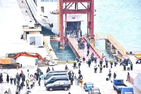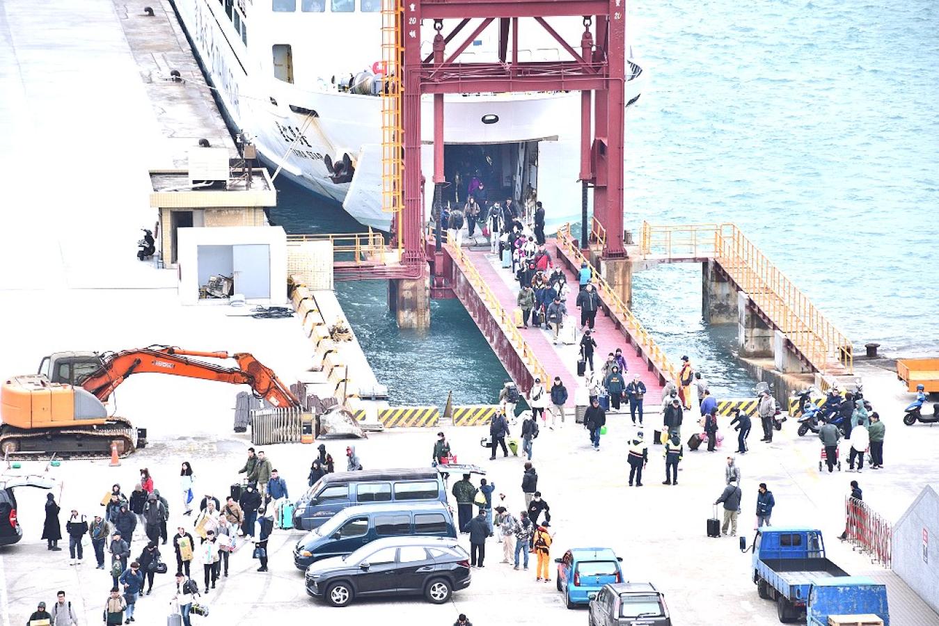 寒冬時節海象不穩,船班停航成為常態,東引近期幾乎不見觀光客蹤影,碼頭往返多為收假與休假官兵。停航5天後,昨日在中柱港下船的200餘名旅客中,官兵約占8、9成;搭船返回基隆的176名旅客,同樣以休假官兵居多,碼頭人潮來去匆匆,少了觀光季的熱鬧氣氛。