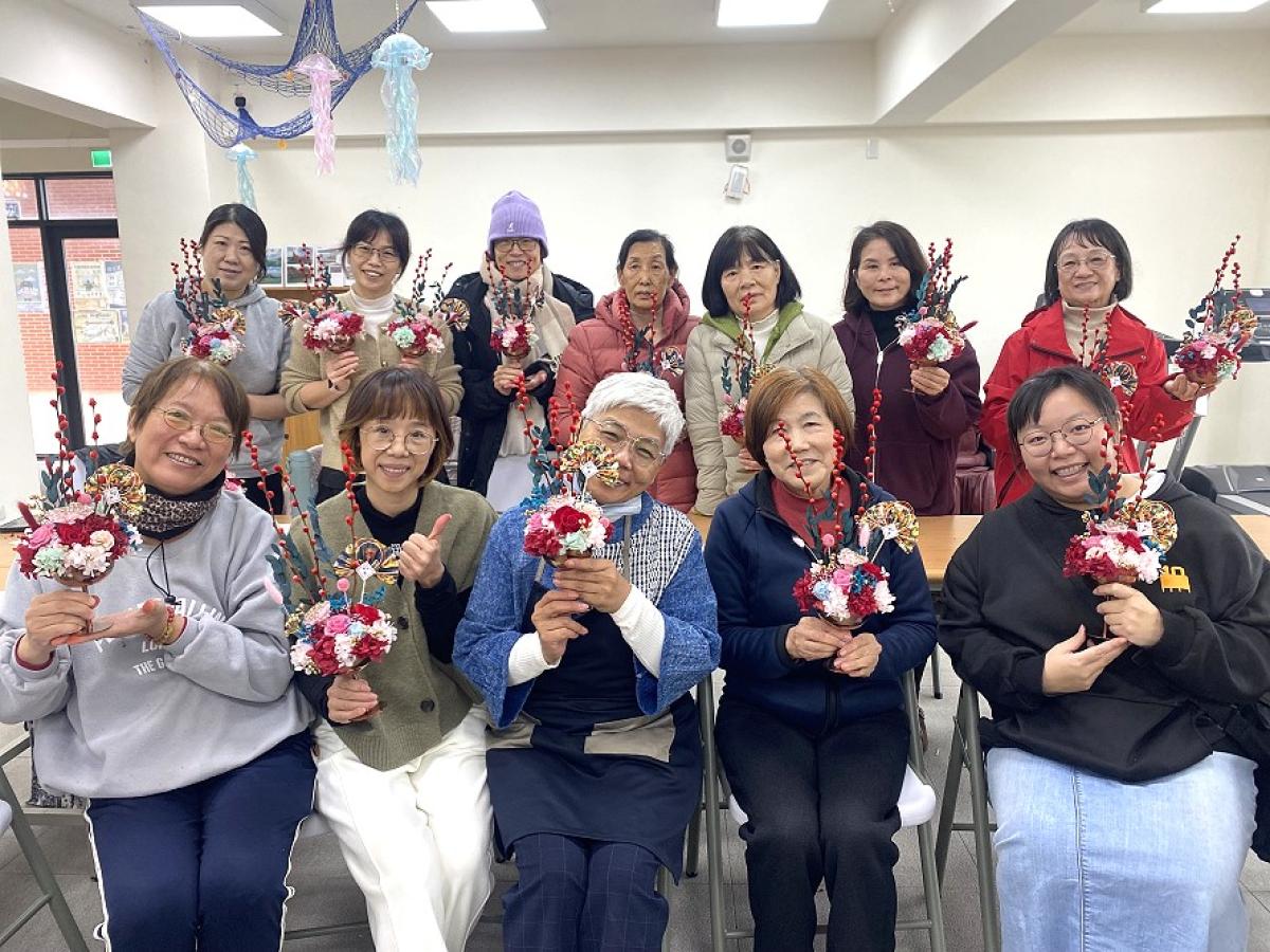 活動中,在講師萬啟秀引導下,學員依序進行花材配置與組合,完成各具特色的永生花作品。過程中,大家專注投入創作,並不時交流製作技巧與搭配想法,現場氣氛輕鬆溫馨,也讓活動中心洋溢著濃厚的年節氛圍。