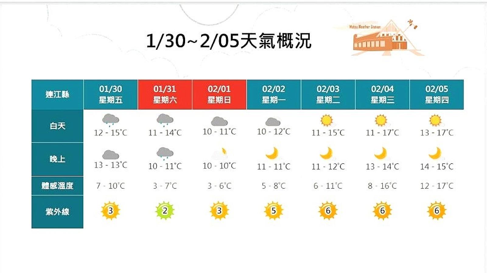 2月1日(日)至2月3日(二)東北季風持續影響,期間馬祖受東北季風影響更為明顯,氣溫偏低,低溫約11度,高溫僅12至15度,並伴隨較強風勢與較大浪高。