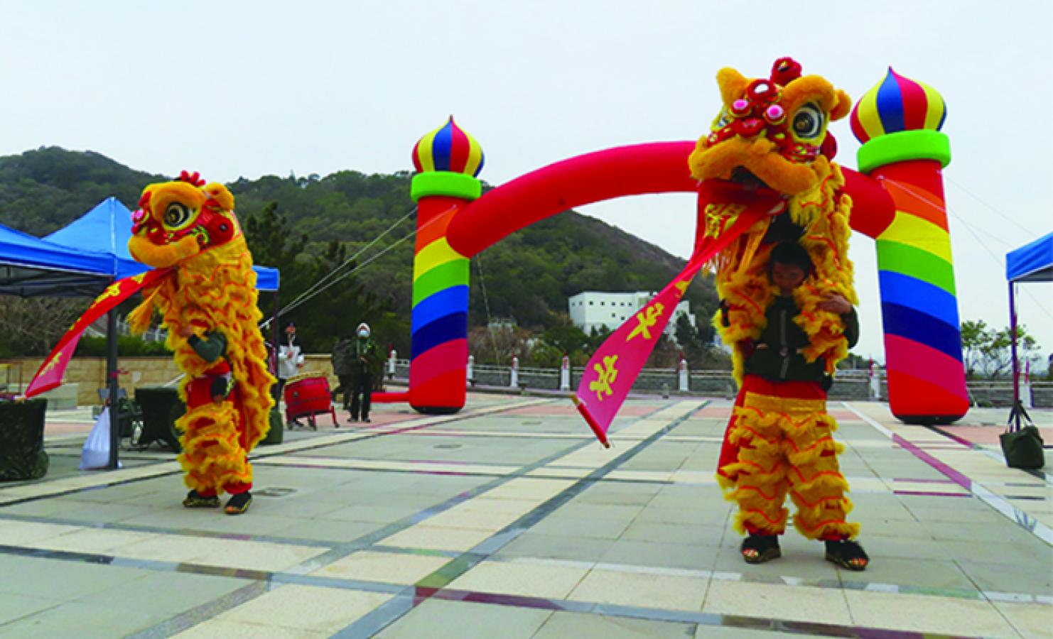 【特約記者林哲良/南竿報導】為提升後備軍人晉升暨表揚典禮士氣,馬防部特派舞獅隊配合後備服務中心擔任典禮開場演出。舞獅隊社員平時運用每週社團活動時機積極訓練,並聘請專業師資到場指導;典禮前亦實施現地集訓,以熟悉場地動線與演出流程。活動當日,兩頭舞獅在鼓、鑼聲配合下完成展演,為典禮揭開熱烈序幕。