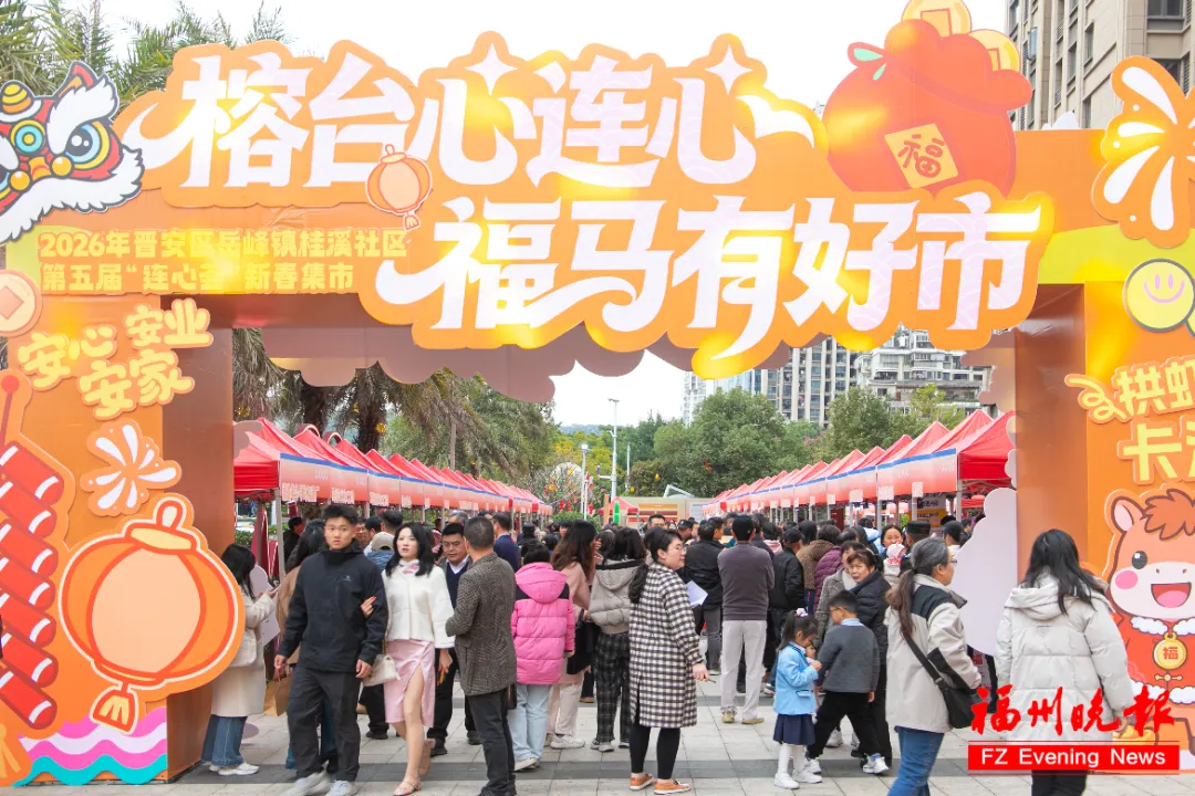 1月30日,「榕台連心 福派晉享」2026年晉安區岳峰鎮桂溪社區第五屆「連心薈」活動,在桂溪社區兩岸社區交流中心廣場舉辦。活動以沉浸式年俗體驗為核心,讓兩岸同胞在濃郁年味中敘情誼、傳文脈、享團圓。