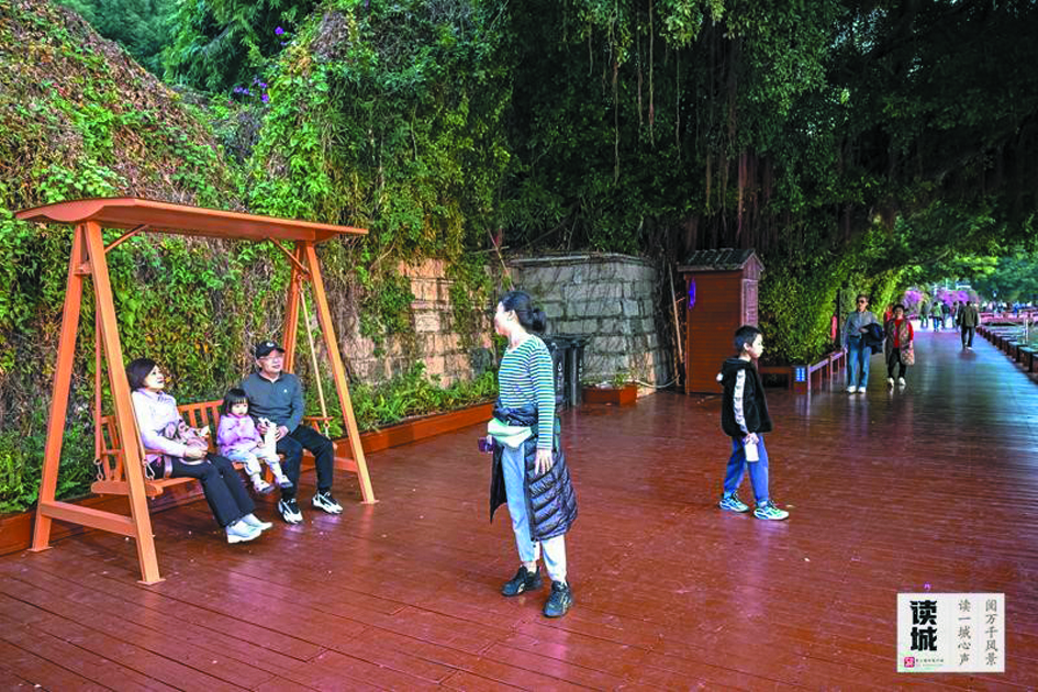 一張張秋千椅的「入駐」,也在園內「種」下了閩都文化的魅力。據西湖公園管理處介紹,在環湖木棧道安裝秋千椅,不僅是為了增加遊園的趣味性,同時也是喚醒福州流傳千年的記憶。