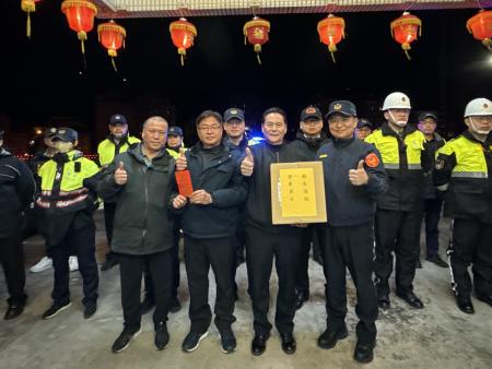 慰勉後,執勤人員於警局前集結就位,各隊菁英精神抖擻、隊伍整齊劃一;在縣長王忠銘等人的目送下,車隊匯集出發,在警燈閃爍的寒夜中展現守護家園的決心。