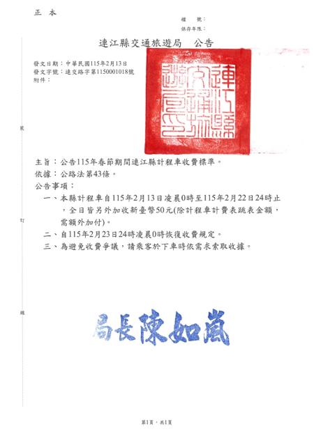 公告115年春節期間連江縣計程車收費標準