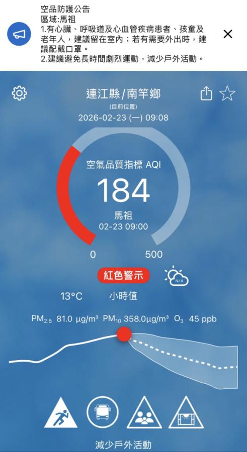 【本報訊】今(23)天是開工日,馬祖空氣品質指標(AQI)飆升至紅色警示,對所有族群均屬不健康。環資局建議民眾應避免長時間或劇烈戶外活動,並配戴口罩;上午9點,AQI指標已達184。