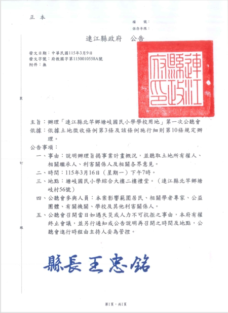 「連江縣北竿鄉塘岐國民小學學校用地」第1次公聽會