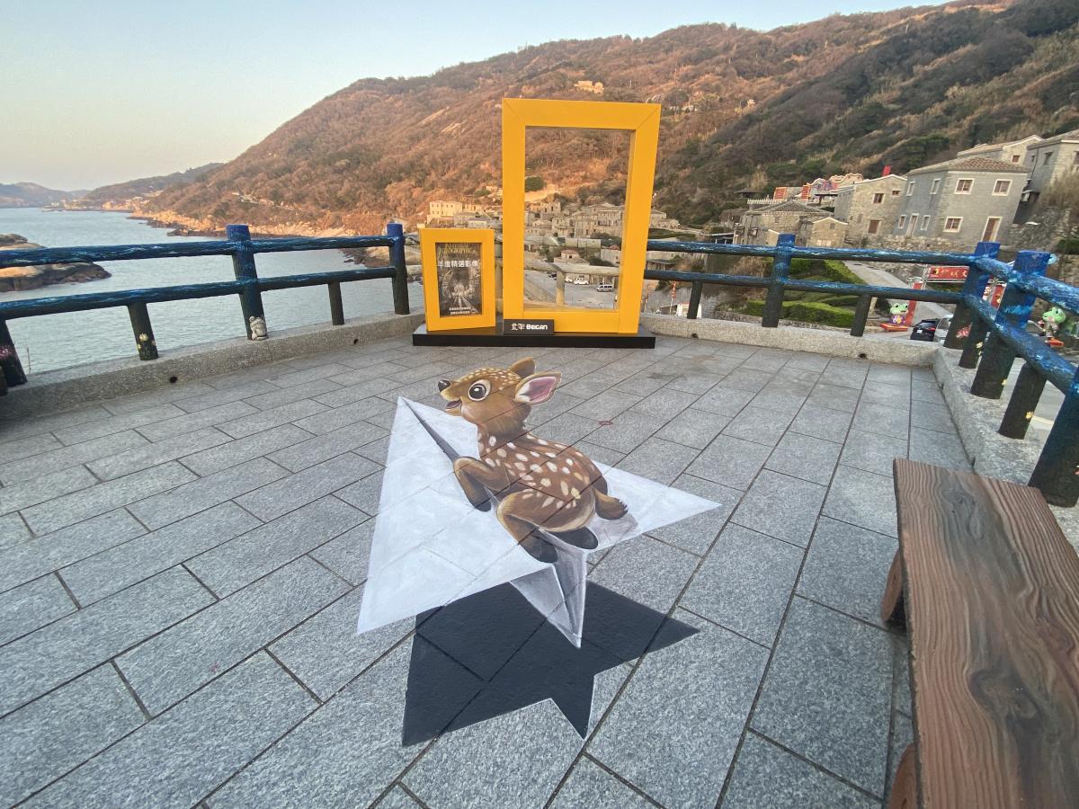 北竿鄉公所表示,此次芹壁打卡區彩繪設計結合在地景觀與互動拍照概念進行規劃,黃框後方欄杆融入芹壁地景線條進行彩繪設計,並於地面設置拍照點位標示,遊客可依指示取景拍攝,使畫面與後方聚落建物線條相互呼應。此外,地面彩繪以大坵島梅花鹿為創作主題,採3D立體彩繪方式呈現,設計遊客與梅花鹿一同乘坐紙飛機飛翔遨遊的趣味畫面,增添拍照互動效果,也讓旅人在打卡拍照時留下更具特色與趣味的旅遊記憶。