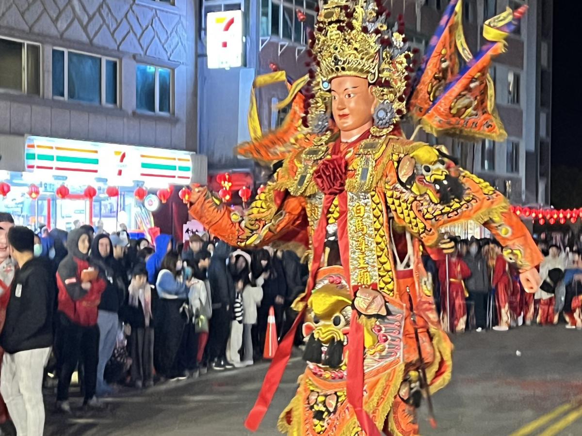 遶境隊伍晚間六點出宮,大批民眾恭迎白馬尊王出巡,沿途鞭炮、鑼鼓聲不絕於耳,象徵慶典氣氛,保長公在前開道,清道旗、開導鑼緊跟在後,燈籠隊、鑼鼓隊、旗隊等依序列隊,諸神轎鎮守遊行隊伍末;今年有馬祖金虎爺會首次加入遶境遊行,過程加入「虎爺吃炮」習俗,台灣宗教文化來到馬祖,展現地區宗教多元包容。