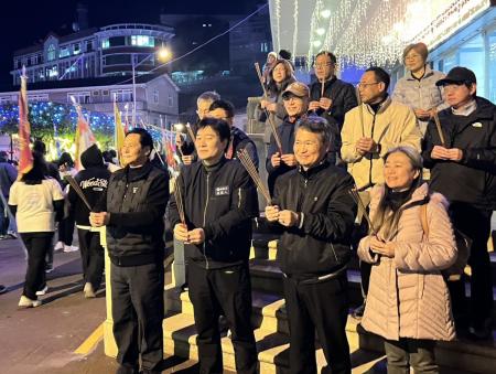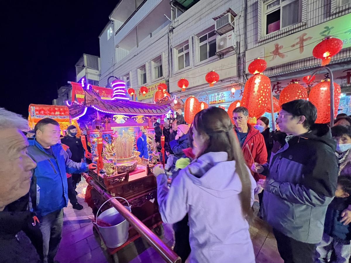 隊伍行經縣府前,縣長王忠銘率縣府團隊迎接遊行隊伍敬香,祈求保佑馬祖平安、縣運昌隆。