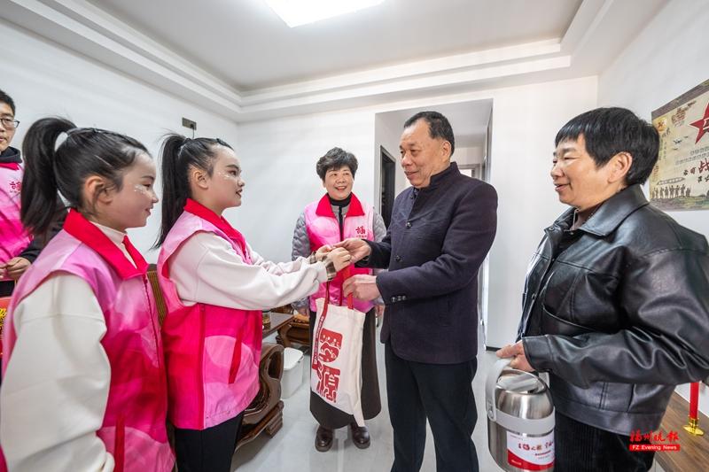 「孝老一家親·溫情送上」走訪活動隨後展開,志願者、學生代表深入鳳山鎮閩鳳社區走訪空巢老人、高齡老黨員等群體,送上拗九粥、長壽麵、牛奶等慰問品與節日祝福,並幫忙整理家居衛生、陪老人聊天,瞭解他們的生活狀況與實際需求。