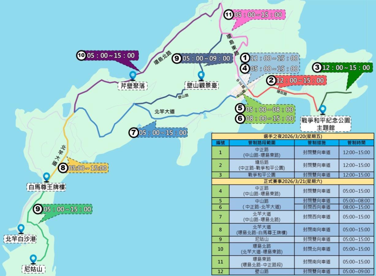 2、中山路(中正路-北竿大道)5時至8時封閉雙向車道,8時至15時封閉西向車道。