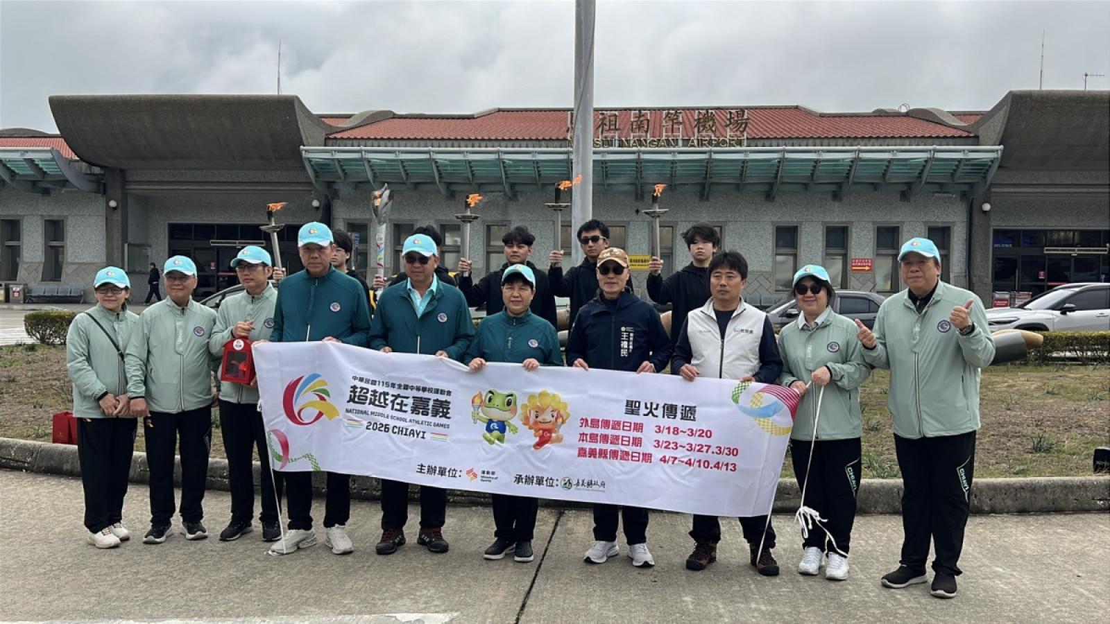【本報訊】115年全國中等學校運動會4月18日至23日在嘉義縣登場,15日引燃大會聖火後,首先前往金門、馬祖、澎湖三離島縣市。嘉義縣教育處長李美華、嘉義縣體育會理事長翁聰賢等人率聖火組抵達馬祖,並交由教育處長王禮民、馬祖角力隊完成聖火交接、傳遞任務,連江縣代表隊將由角力隊參賽。