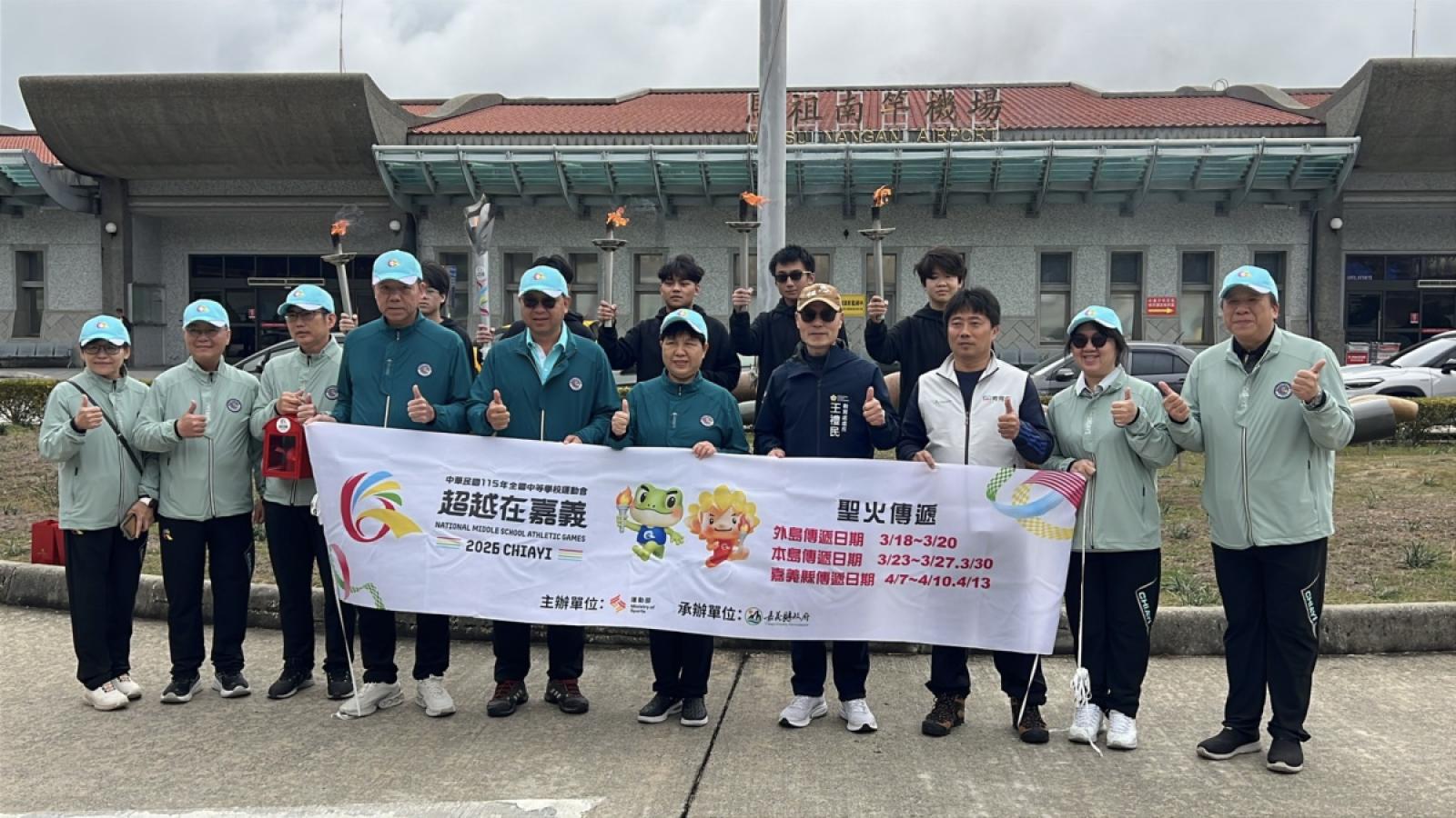 【記者馮紹夫報導】115年全國中等學校運動會4月18日至23日在嘉義縣登場,15日引燃大會聖火後,首先前往金門、馬祖、澎湖三離島縣市。嘉義縣教育處長李美華、嘉義縣體育會理事長翁聰賢等人率聖火組抵達馬祖,並交由教育處長王禮民、馬祖角力隊完成聖火交接、傳遞任務,本屆全中運連江縣代表隊將由角力隊參賽。