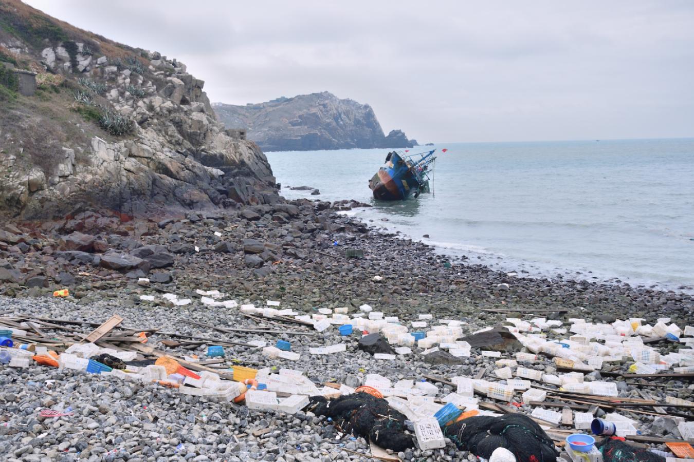 不過,失去動力的漁船隨著東北風一路漂流,最終擱淺在東引北澳口礫灘。現場不僅出現柴油外洩,連南澳東堤都聞得到油味,塑膠容器等海漂垃圾也被沖上岸,造成環境污染。
