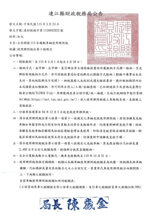 連江縣財政稅務局公告/開徵115年機動車輛使用牌照稅