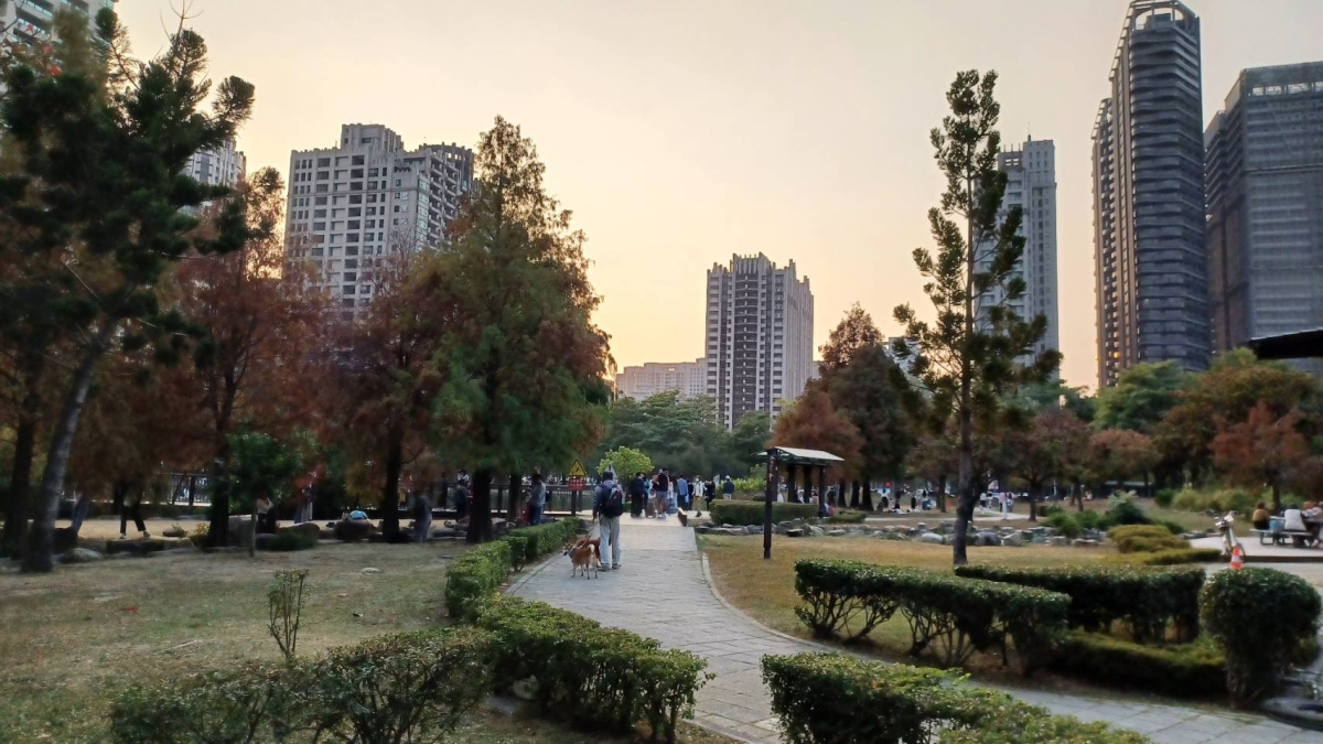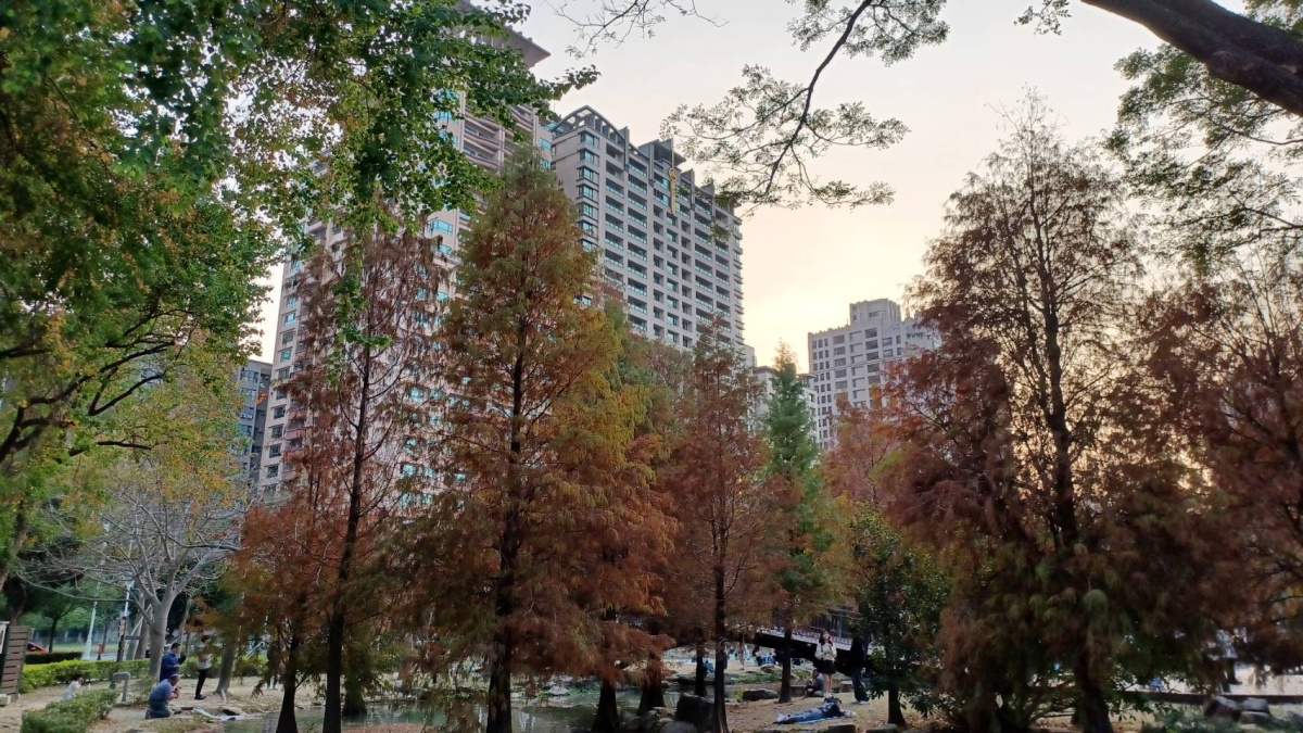 很難想像,在高樓大廈櫛比鱗次、車水馬龍川流不息的都市叢林裡,竟然隱藏著如此一處宛如山林秘境的所在。夕陽西下,金黃色的餘暉斜斜灑落,為整座公園披上一層溫柔而靜謐的光影。成排的落羽松在光線映照下,顏色層次分明,從翠綠、橙黃到深褐交錯其間,隨著微風輕輕搖曳,宛若一幅會呼吸的風景畫。許多遊人不約而同地停下腳步,舉起手機或相機,想要留住這季節限定的美景,彷彿慢了一步,便會錯過眼前這份稍縱即逝的感動。