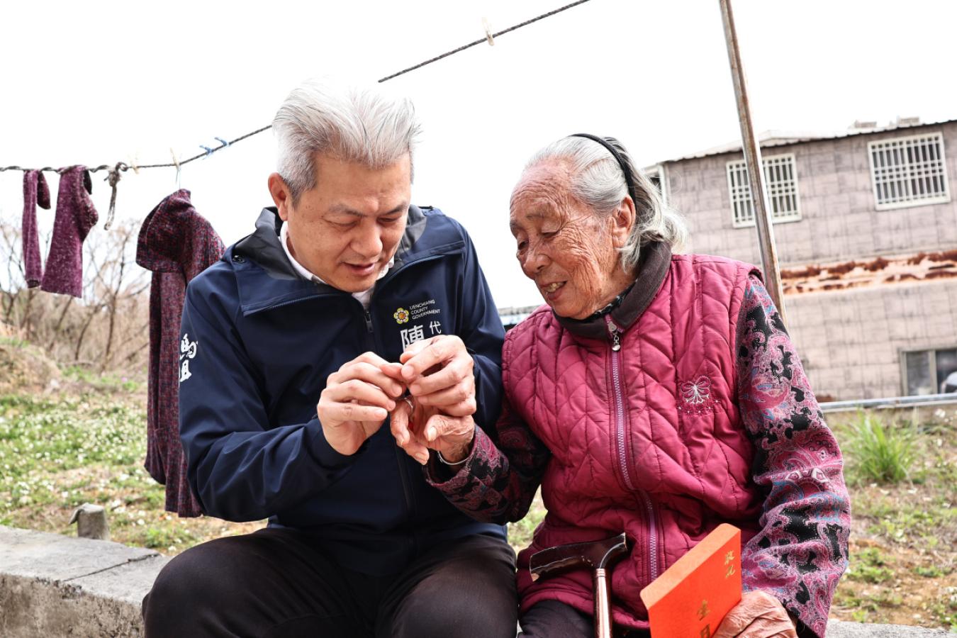 【記者王致潔報導】南竿鄉珠螺村楊金珠女士歡慶92歲壽辰!昨(26)日上午9時,代理秘書長陳明傑代表縣長王忠銘,偕同民社處副處長劉剛、南竿鄉公所秘書徐雲輝等人登門祝壽,關心長者生活,表達地方政府對耆老的敬意。陳明傑為楊金珠女士戴上象徵長壽與福氣的金戒指,徐雲輝則代表公所獻上生日禮金;壽星之子陳新光夫婦亦陪同在側,氣氛溫馨。