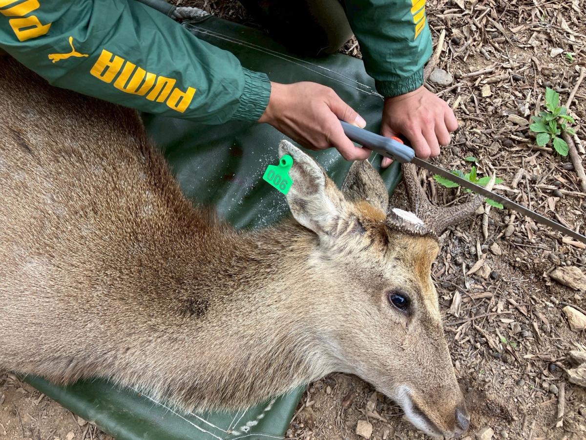 產發處表示,作業全程由專業獸醫師依動物醫療及野生動物管理原則執行,確保在不影響梅花鹿健康及整體生態平衡之前提下,進行必要之安全管理措施。獸醫團隊在執行鋸角作業後,同步為該批公鹿繫上「耳標」作為辨識,以便管理單位日後能精確掌握特定鹿隻的行為特徵與健康狀態,落實科學化的生態管理。