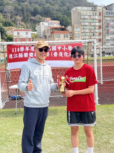 【本報訊】連江縣114年國小樂樂棒球賽今(29)天上午在福澳運動場舉行,介壽、中正、塘岐、仁愛四校參賽。經過一整天激烈競逐,塘岐國小全勝奪冠,後續名次依序為:介壽、中正、仁愛;塘岐國小周嫻瑈安打、打點數均是最高,她在對介壽的比賽中,單場2支三壘安打、1支全壘打,共10分打點,是塘岐奪冠大功臣,獲選「最佳貢獻獎」,意即最佳MVP。