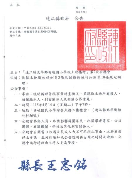 辦理「連江縣北竿鄉塘岐國民小學學校用地」第二次公聽會。
