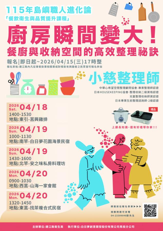【本報訊】廚房總是擁擠、東西找不到、做起來卡卡的嗎?其實問題往往不在空間大小,而在收納方式!衛生局將於4月18日至20日在四鄉五島舉辦「島嶼職人進化論-餐飲品質提升課程」第二階段課程,聚焦餐廚收納與動線規劃,教導業者和民眾如何透過器具定位、分類收納與流程順化,將有限空間發揮最大效益,全面提升出餐效率與工作節奏。課程免費,報名自即日起至4月15日(三)17時止。(報名連結:https://forms.gle/kscS4xK43NXrU6xe6)