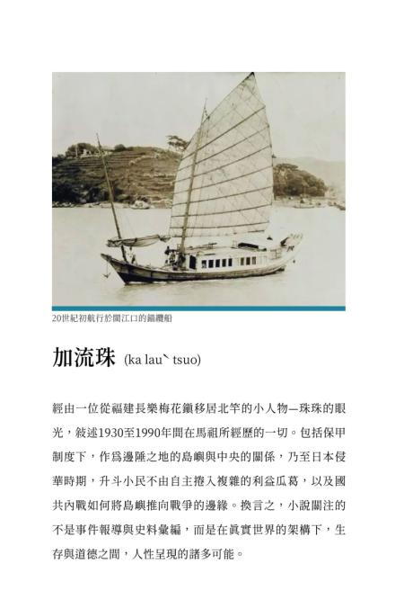 我以耆老的口述為本,兩冊傳記為輔,嘗試透過一位從長樂梅花移居北竿的小人物—珠珠的視角,敘述1930至1990年間所經歷的一切。包括保甲制度下,作為邊陲之地的島嶼與中央的關係,乃至日本侵華期間,升斗小民不由自主捲入複雜的利益瓜葛,以及國共內戰如何將島嶼推向戰爭的邊緣。換言之,小說關注的不是事件報導與史料彙編,而是在真實世界的架構下,生存與道德之間,人性呈現的諸多可能。
