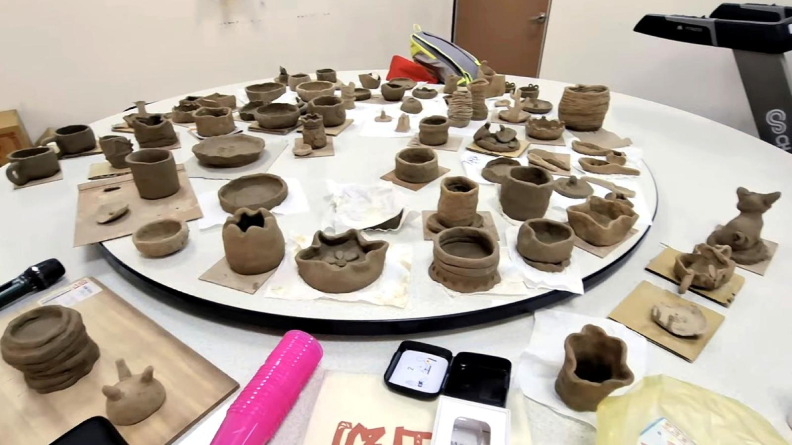 縣長王忠銘等人向參與「綠色照顧站」課程的長者們致意;現場展示長者們親手製作、充滿生命力的陶藝作品,展現在地老化的幸福與韌性。(圖:縣府)