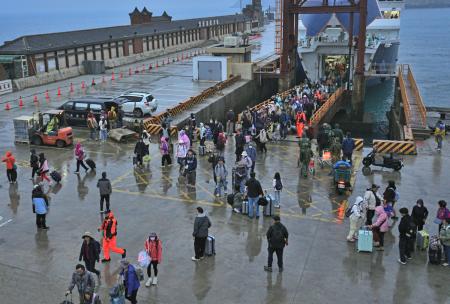【本報訊】東引中柱港今天早晨湧入約300名旅客下船,創下今年單日新高,人潮、車潮交織,島上瞬間充滿活力。