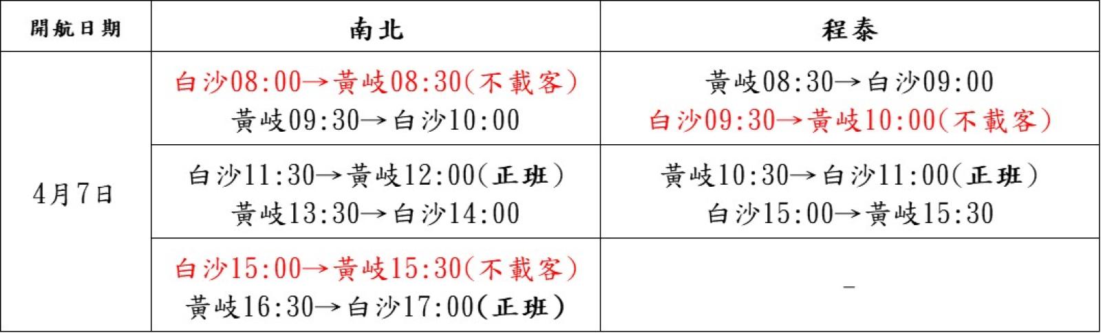 2、白沙11:30→黃岐12:00,黃岐13:30→白沙14:00。