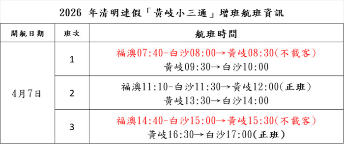本公司增開「黃岐小三通」船班,並調整固定航班時間,相關航班自公告後開放訂位。