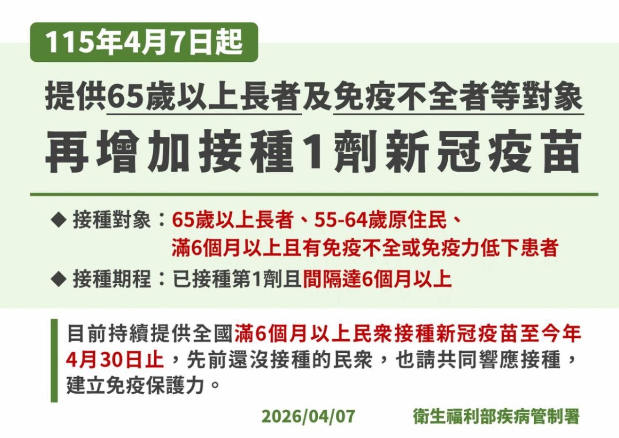 4月7日起,衛生局提供65歲以上長者、55-64歲原住民及免疫不全者再增加免費接種1劑新冠疫苗。(圖/文:王致潔)