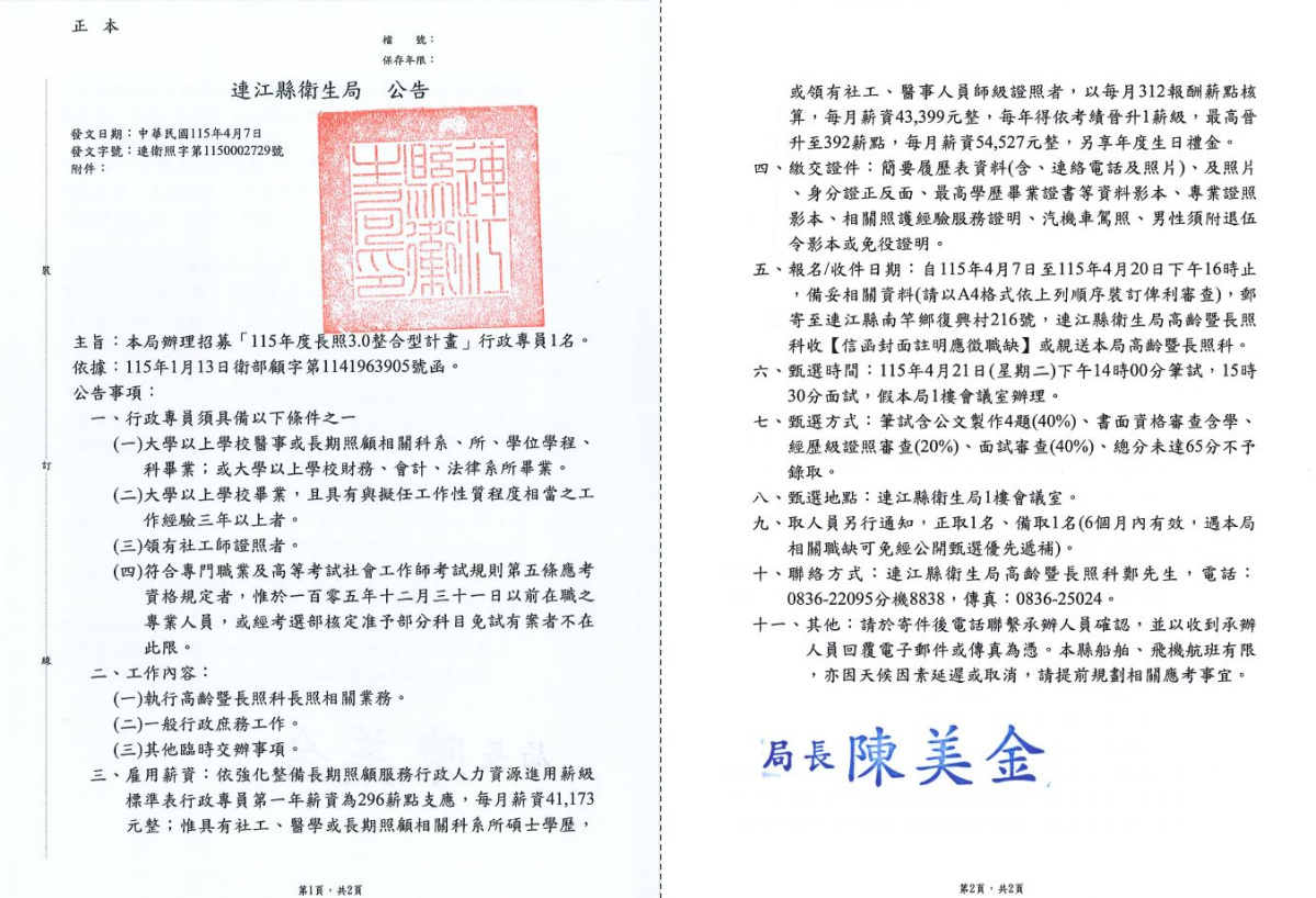 連江縣衛生局徵選長照3.0整合型計畫行政專員1名