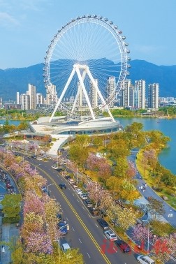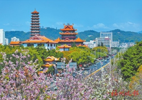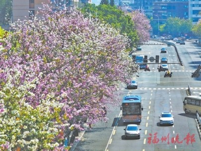 【福州晚報訊】連日來,福州氣溫回暖,市區多條主幹道兩側的洋紫荊、羊蹄甲等提前開放,紅白相間的花朵點綴枝頭,成為街頭一景,扮靚榕城。