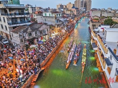 端午時節,長樂民俗活動精彩紛呈。三溪村“千年古村·龍舟夜韻”活動,以沉浸式食俗體驗為核心,打造“吃宴席、逛市集、玩民俗”的全天候文旅動線。夜幕之下,龍舟掛燈競發、鑼鼓齊鳴,非遺工坊、龍舟文創、僑鄉好物沿溪佈設,親子家庭可參與夜賽龍舟紙雕燈製作、龍舟模型拼裝、點雄黃等民俗體驗,留下“白天體驗民俗、夜晚觀賽龍舟”的完美端午記憶。