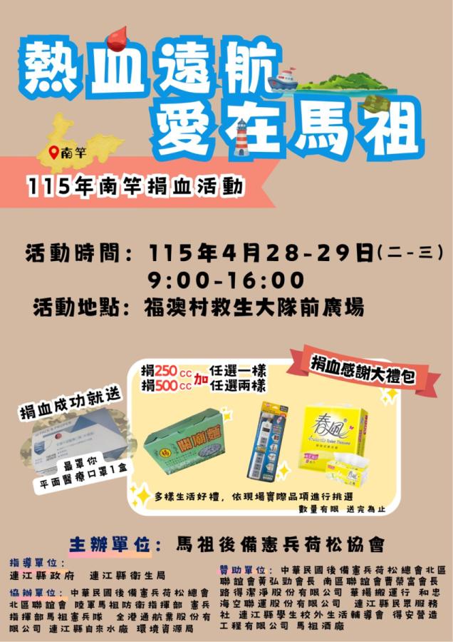 馬祖後備憲兵荷松協會理事長趙泊淯說明,活動將於4月28日(二)至4月29日(三)在南竿福澳村救生大隊前廣場舉辦,捐血成功就贈送口罩一盒,依捐血量贈送關廟麵、延長線或衛生紙等感謝禮。