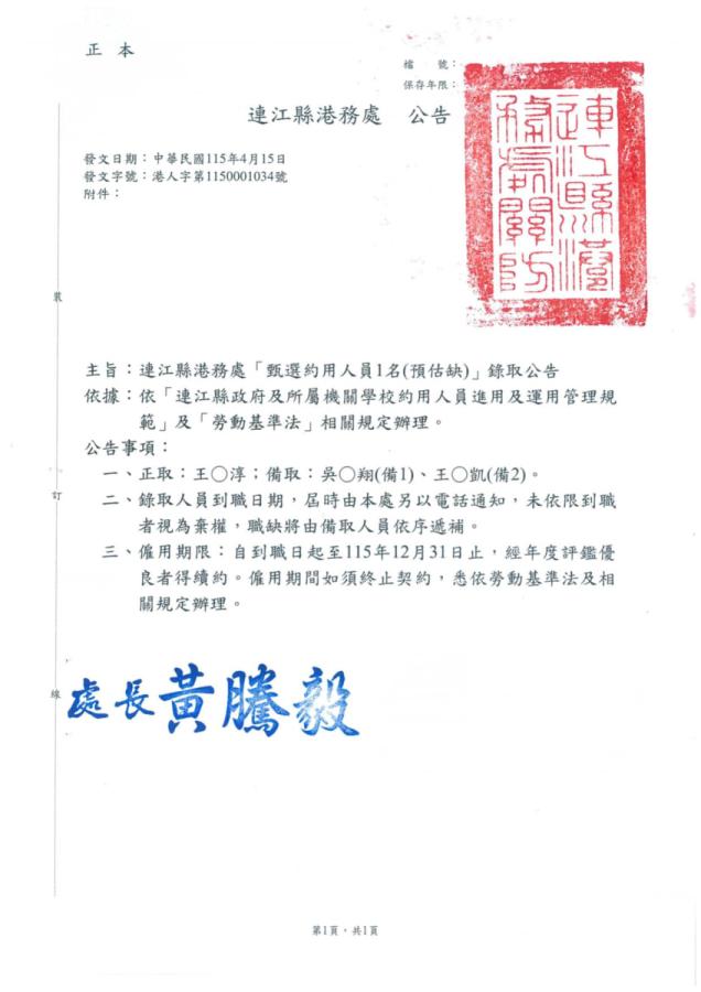 連江縣港務處「甄選約用人員1名(預估缺)」錄取公告