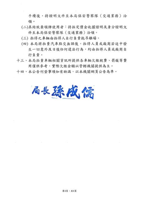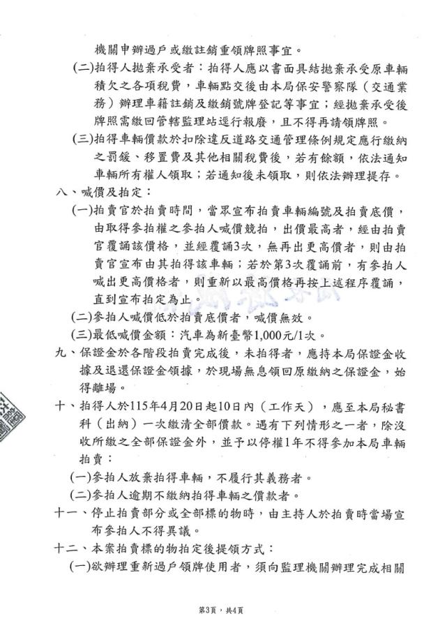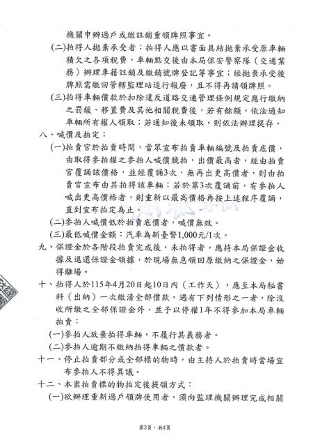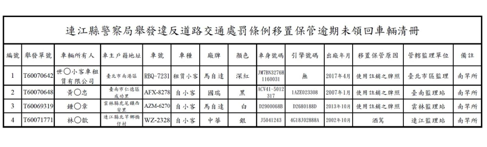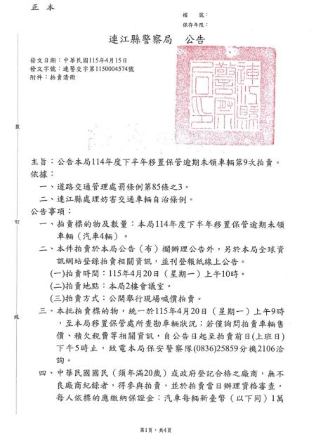 連江縣警察局114年度下半年移置保管逾期未領回車輛第9次拍賣公告