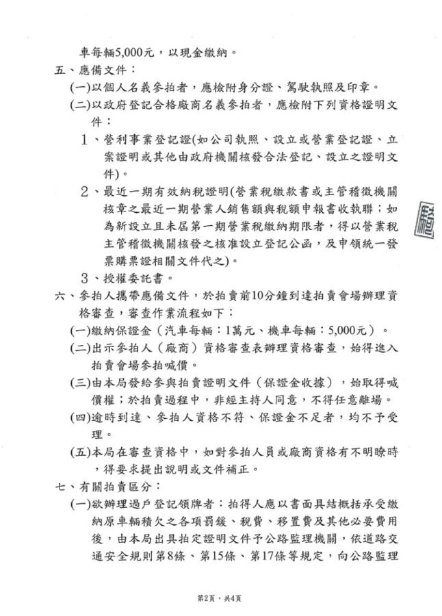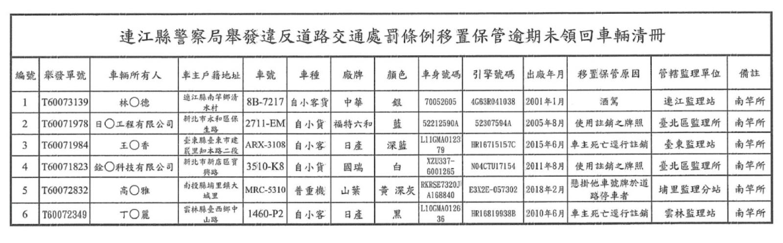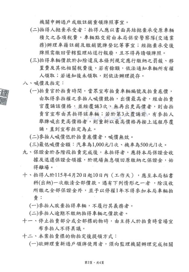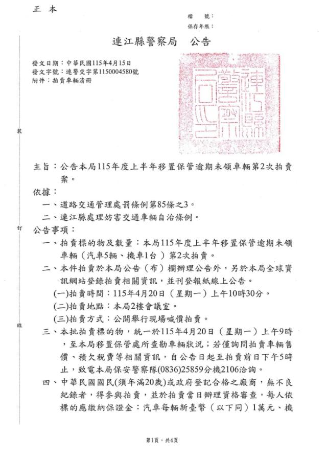 連江縣警察局115年度上半年移置保管逾期未領回車輛第2次拍賣公告