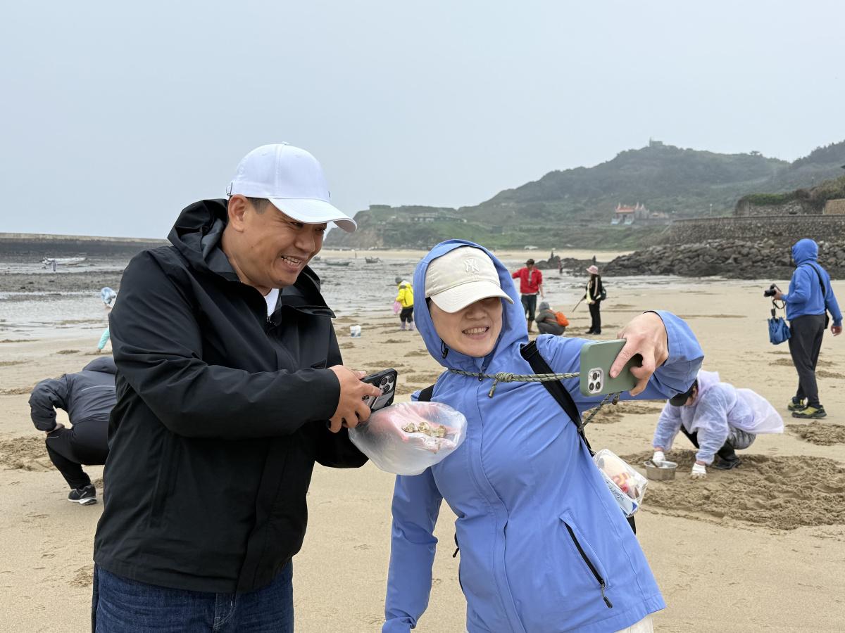 【記者蔡夢玲報導】淨灘結束後,福正沙灘緊接著轉為另一種熱鬧場面!搭配著大潮水,馬管處安排挖花蛤活動,由多位在地挖蛤達人分頭帶領,伴著鄉親與遊客走進潮間帶,體驗東莒潮間帶之美。