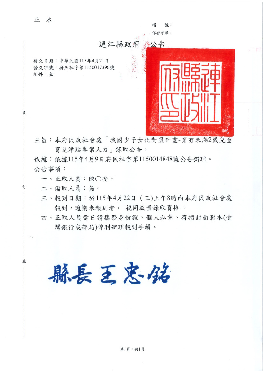 連江縣政府民政社會處「我國少子女化對策計畫2.0-育有未滿2歲兒童育兒津貼專案人力」錄取公告
