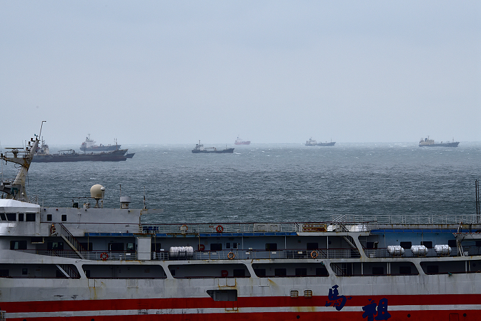 受東北季風增強及颱風外圍環流影響,昨天東引海域浪高達4至5公尺,海上白浪滔滔。臺馬輪停駛,繼續停泊中柱港避風頭之外,港外也錨泊了數十艘貨輪、漁船,都在靜待這波風浪轉弱變小。(圖/文:陳其敏)