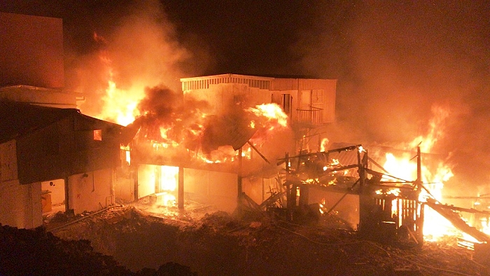 西莒青帆村13日晚間驚傳火警,7+2(指青帆珍珍飲食店一排民房)木板無人居住舊房付之一炬,所幸人員平安。(圖:宋幸儒)