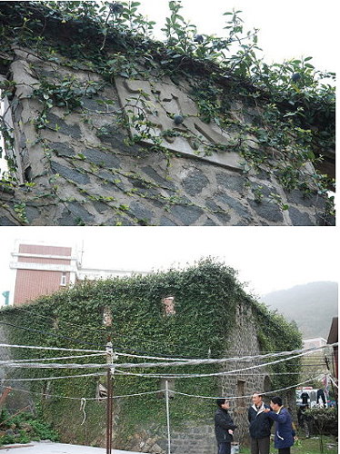 馬祖大樓青石牆正門屋簷有泥刻「馬祖日報」四字,目前被薜荔蔓藤的覆蓋,只剩下「報」字及本報在現場與馬港社協及鄰居訪談了解大樓歷史背景和人物。(圖:劉秋月)