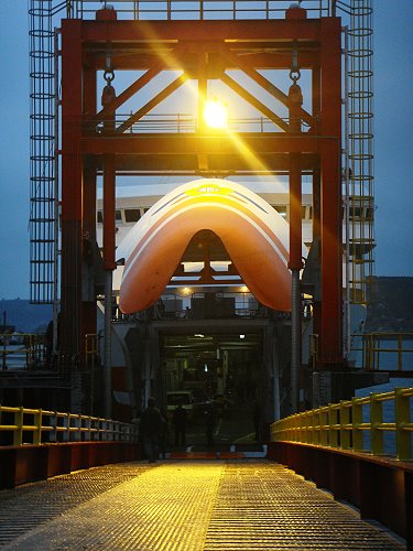 昨天上午六時許,在微亮天色中,臺馬輪船艏甲板順利垂降在升降橋上,工程人員檢視連接處沒有問題之後,一輛軍用大卡車緩緩從臺馬輪船艙裡駛出,經過升降橋抵達岸上碼頭,完成新建升降橋的第一次使用。