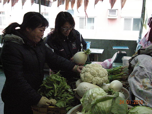 到山隴市場,從一樓菜販到二樓菜攤,叫賣拉客拉得很厲害,很多買菜的鄉親感受冷冬賣菜阿嫂辛苦,及種菜微薄收入,都會「捧場」多買一把 。
