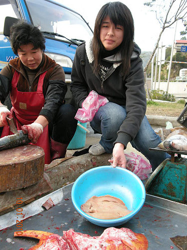 山隴市場前天有隻二十幾斤的魟魚,黃色魟肝有兩斤半,賣二百元台幣。