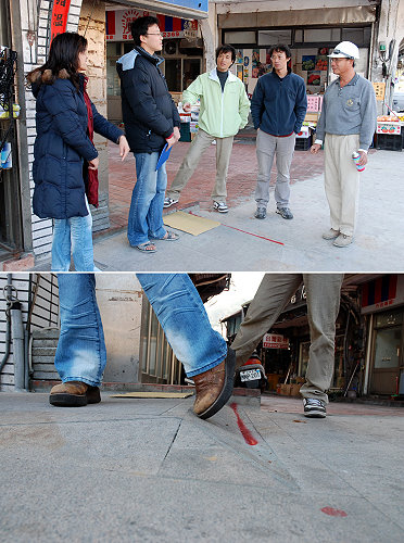 介壽廣場人行道邊「跌聲不斷」,鄉民代表陳錦泰會同相關單位代表及受害民眾前往現勘,認為肇禍原因就是人行道邊的「車阻」,因為顏色與地坪過近,以致路人未能察覺而跌倒摔跤。(圖/文:曹重偉)