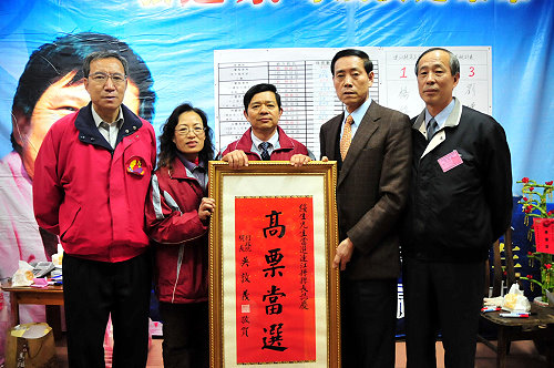 楊綏生當選第五屆縣長,福建省政府第一組組長楊誠璽特別代表行政院長吳敦義及省主席薛承泰,致贈恭賀當選匾額。(圖/文:曹重偉)