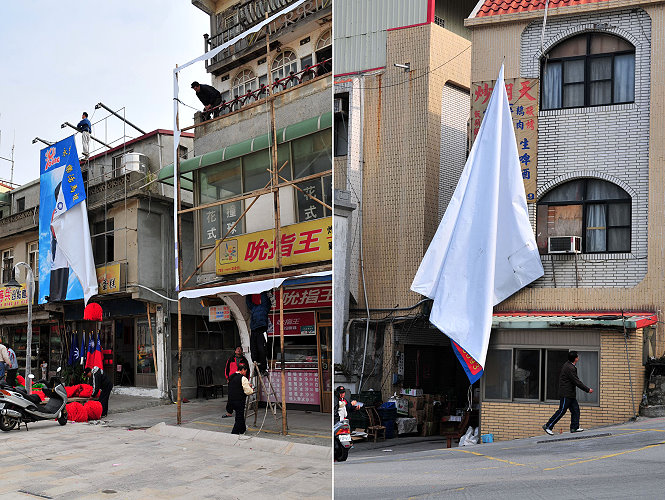 馬祖選舉雖不像台灣那般火熱,但掛旗的「習俗」也是難免;這次三合一選舉,南竿地區就有十幾位候選人,旗幟比往年少,選舉結束後,這些戰旗也隨之謝幕;而今年相當特別的,事前經過環保局多次宣導後,各候選人總部不管選舉結果如何,免催免請,均自行派人清除及回收,各類大型掛布也在人員上上下下忙碌下快速完成拆除,讓各主要道路及村容很快恢復原本的清爽,也算是民主風度的展現。